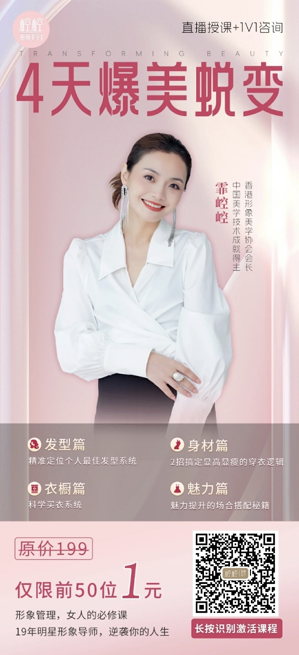💇🏻♀️发型设计:脸型、眼神、头身比8步走,快速找到你的本命发型 👗穿着搭配:利用你的身材优势,旧衣新穿,穿出高瘦美 💃气质修炼:从皮相美到心相美,从头美到脚的漂亮体系 🛍️衣橱收纳:系统归类“杂乱糟”衣橱,如何买对不买贵 👀形象心理:根据不同场景、身形、职业需求等设计“有效穿搭” 1块钱的课程,避免你盲目跟风买衣服彩妆,轻松省下不少钱。