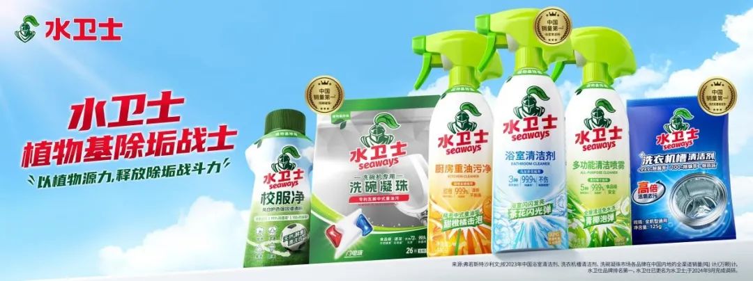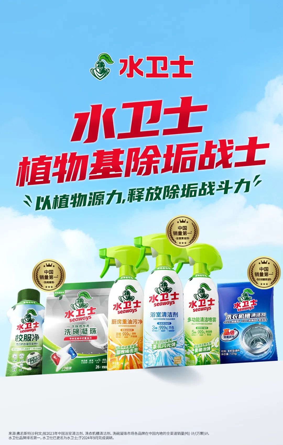 在产品升级上,水卫士重磅升级“植物基源力家族”三大明星单品——水卫士浴室清洁剂、水卫士厨房重油污净、水卫士多功能清洁喷雾。从引入“植物基”配方到产品视觉包装设计,全方位焕新升级产品概念以切实满足消费者对于家庭多场景清洁用品的需求。
