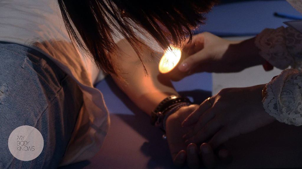成为享受者的角色,戴着眼罩,对触觉的期待更上了一个层级。di蜡,拍打,蒙着眼感知自己的身体,感受着Nancy老师手心对手心的交流,那一刻像是灵魂被击穿了似的,颤栗,无助。