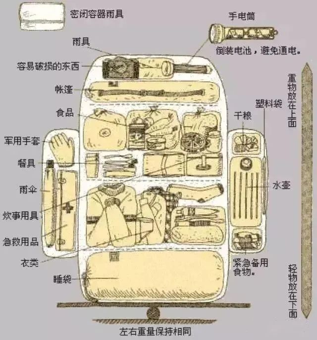 正确打包,前提是记住“轻重缓急”的原则,在这个原则的前提下,要注意背包左右的平衡,不能一边重一边轻,把装备分区域进行放置,同时要注意两肩带要松紧度调节得合适并对等。