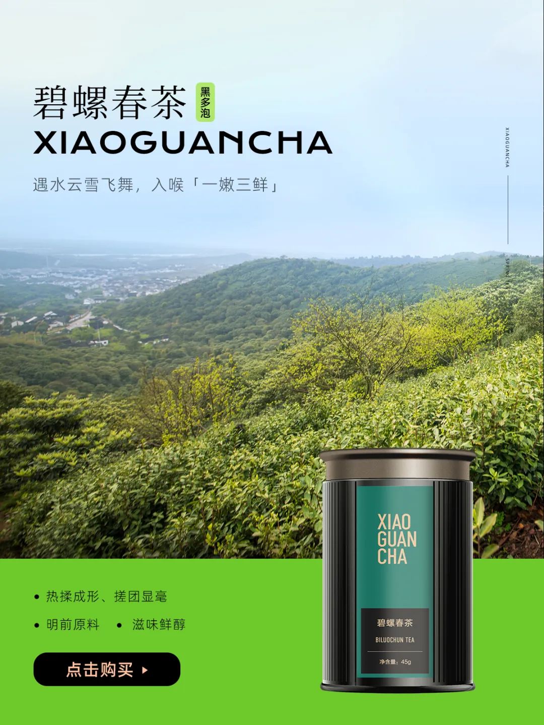 小罐茶的碧螺春选用明前手采一芽一叶至一芽二叶,成茶卷曲成螺,白毫披覆,银绿隐翠。