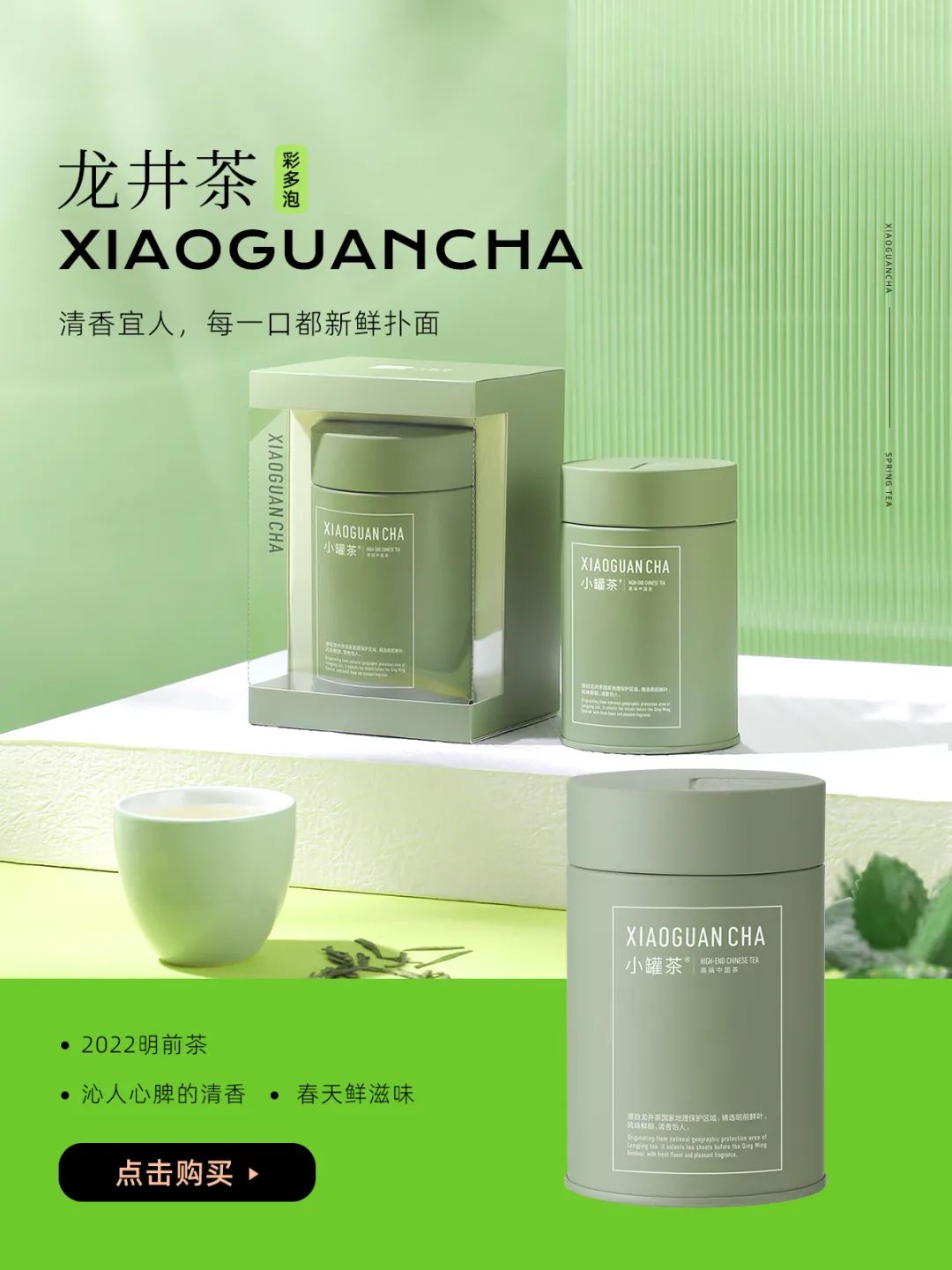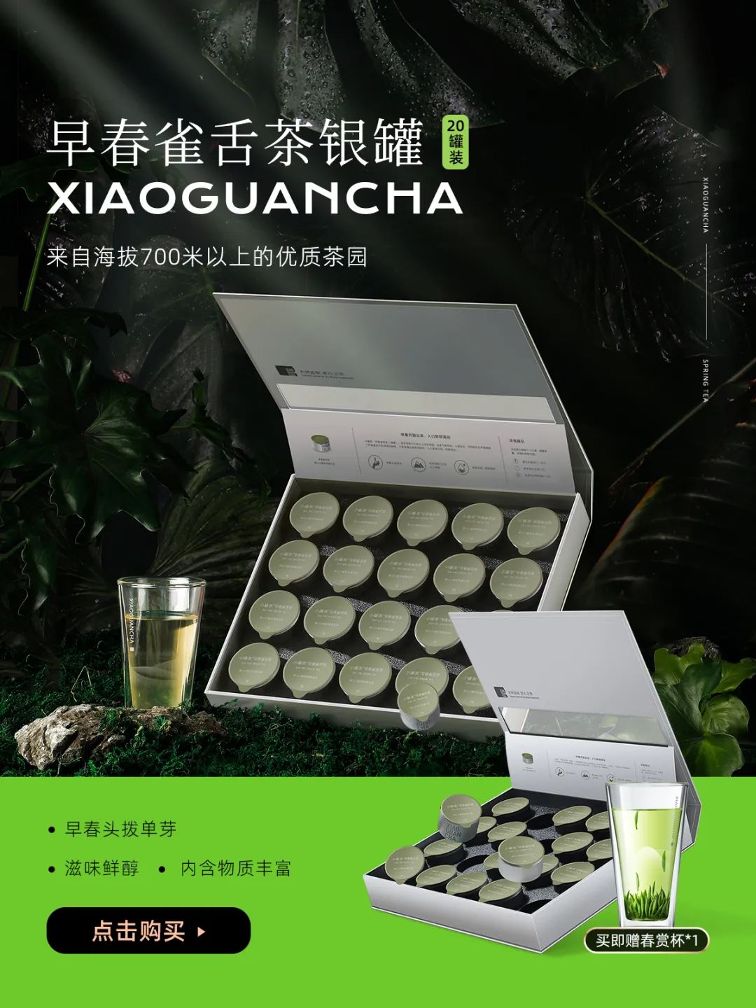 小罐茶的早春雀舌源自海拔700米以上优质茶园,只采早春头拨单芽原料。入口柔美甘甜,鲜醇涌动,汤色清绿明亮,叶底嫩绿匀整,香气高扬。