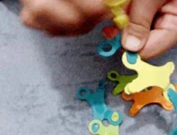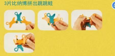 或者玩弹跳跳蛙比赛:先用3片比纳博拼出跳跳蛙,然后,画一条准线,看谁的跳跳蛙跳的远,谁就获胜哦。