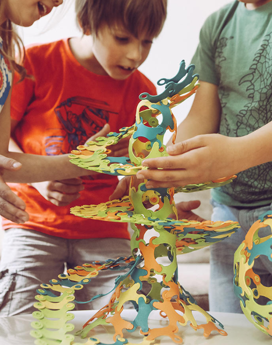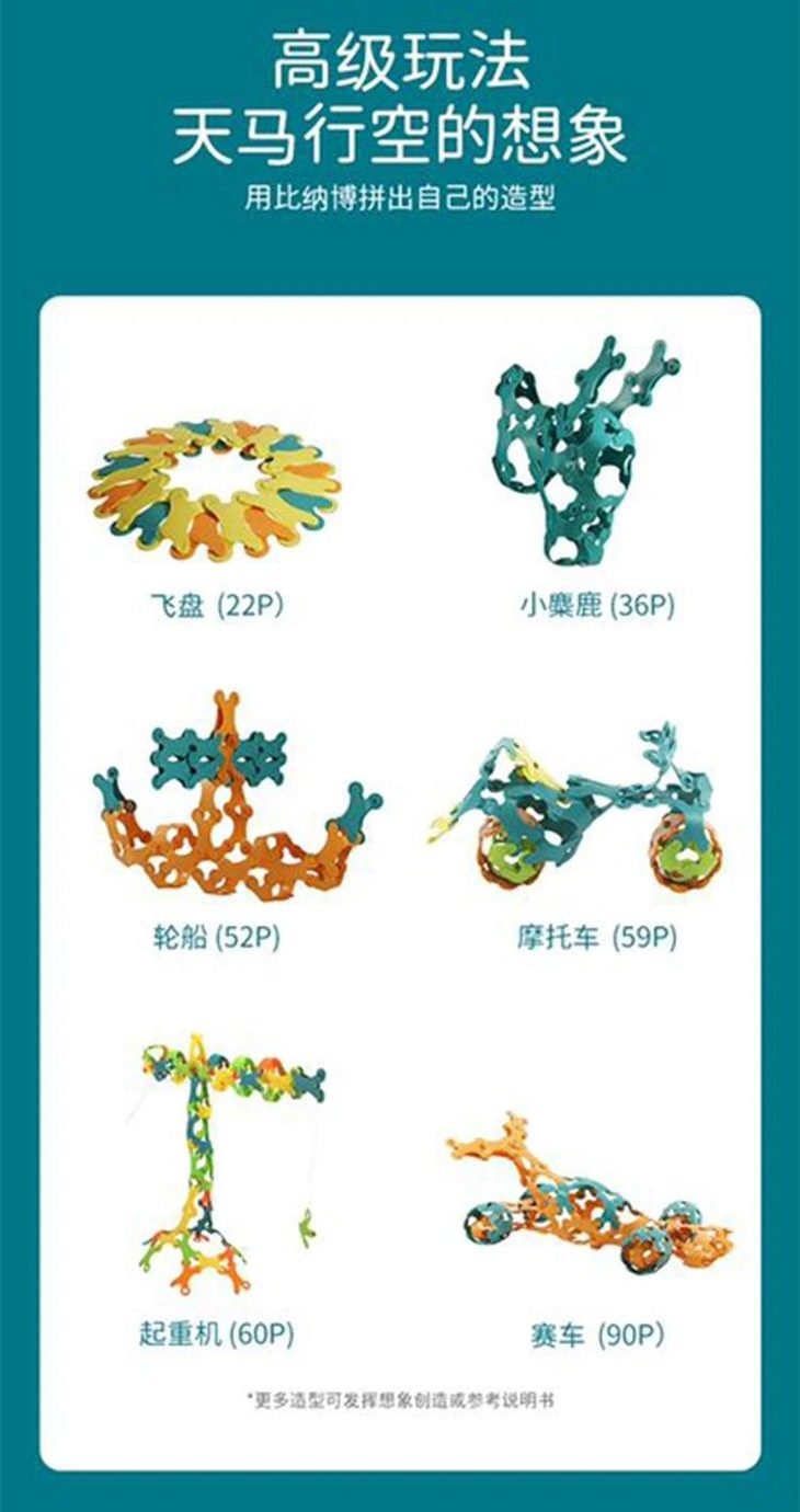 比纳博儿童拼装积木,其组合模式丰富多变。它像编织一样,能弯,能折,还不断,空间、平面、立体……的物体都能拼,在拼装的过程中,孩子的逻辑思维和创造性思维就慢慢地、潜移默化地得到了锻炼和提升。