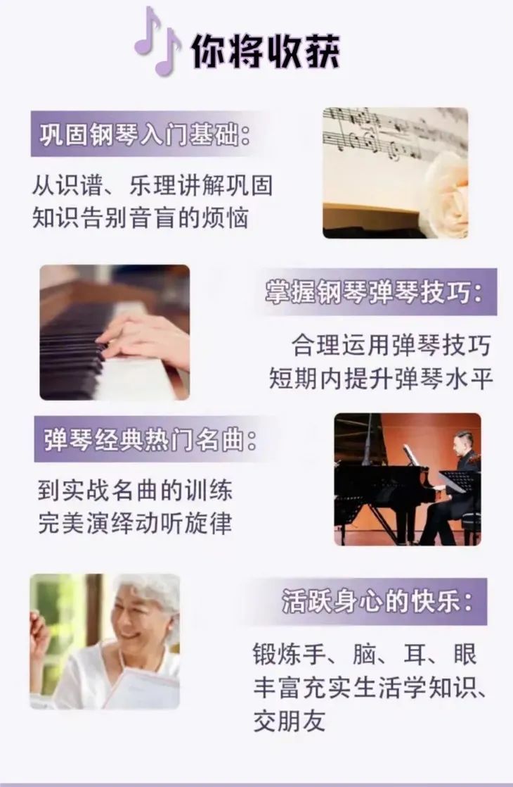 因此,为了丰富中老年人群的兴趣生活,我们专门开设了一堂免费的钢琴教学课!