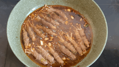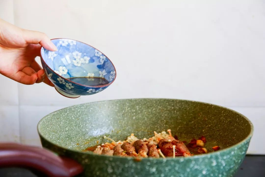 ▼ 5. 装盘享用:红亮亮的汤汁、扑鼻的肉香、爽脆的金针菇...你说说,这到底是什么神仙组合?!