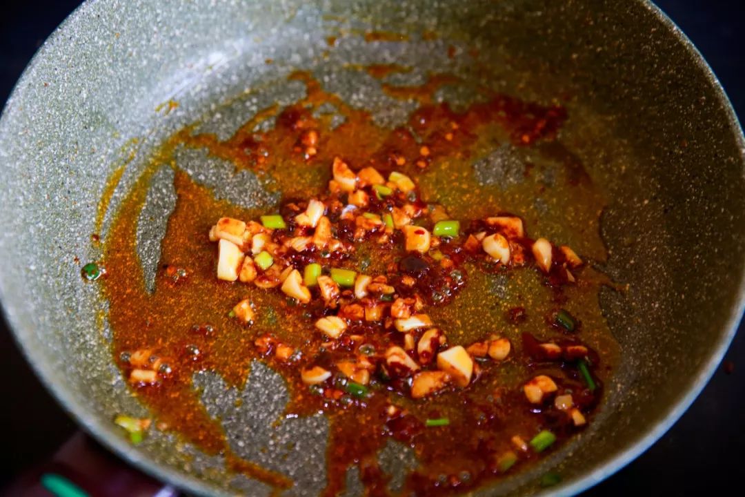 炒出红油后下入葱蒜,煸出香味。