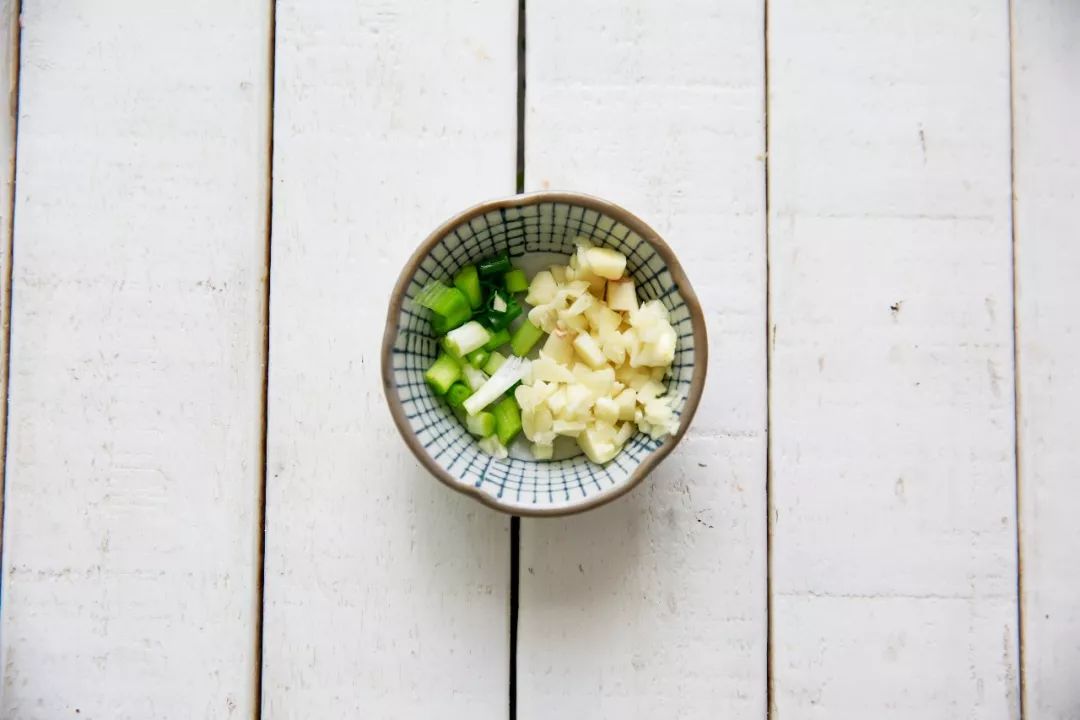 ▼ 1. 处理食材:小葱葱白切小段,葱绿切成葱花,大蒜去皮切末。