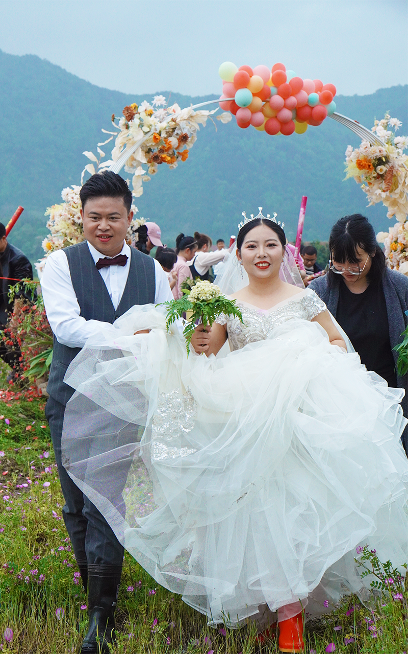 婚礼前一天下了一夜的雨,第二天下午雨停的时候,紫云英田被四周的云海包围着,远处的田块上,成群的白鹭绕着整个山谷盘旋飞上天空,蛙鸣此起彼伏仿佛在奏乐合唱。