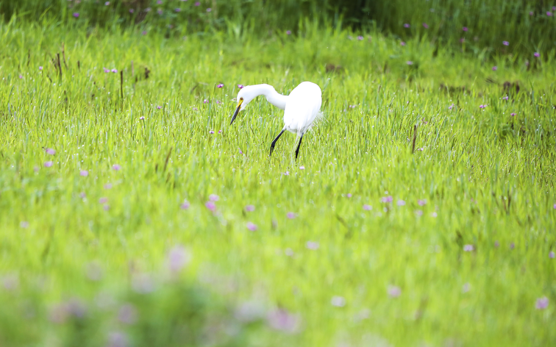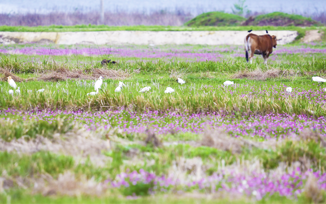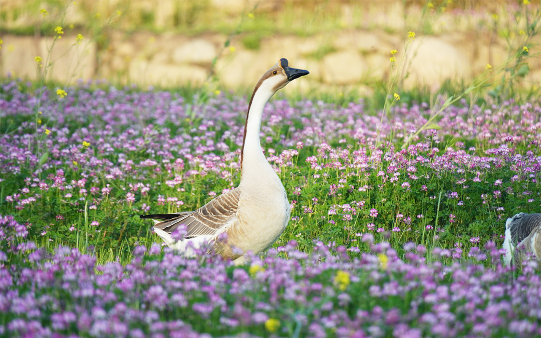 从3月到4月,搬来和紫云英做邻居后,地里一天比一天热闹——漂亮的野鸡在紫云英地里昂首漫步,粗鲁的大鹅在紫云英地里欢呼,优雅的白鹭在紫云英地里梳妆打扮,还有三番五次跑来骚扰我们、赶也赶不走的牛群……当鸟叫蛙鸣在耳边响起,这一瞬间,我们仿佛回到了童年。▲ 灰头麦鸡