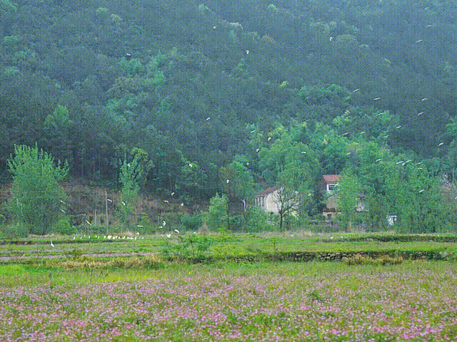 当下正是白鹭繁殖的时节,总是一群一群地出现,月初清明时节,房檐上的燕子窝也飞回了燕子,只等着新破壳的小燕子探出头来。村里的农人告诉我们:在花丛里,不时还可以看到野鸡蛋哩。