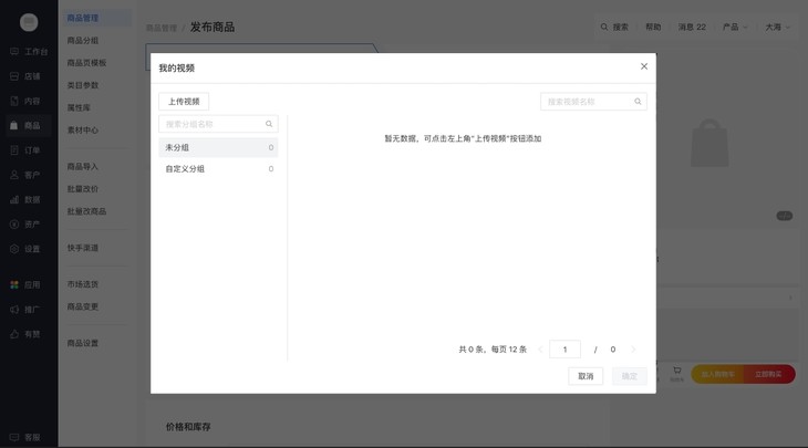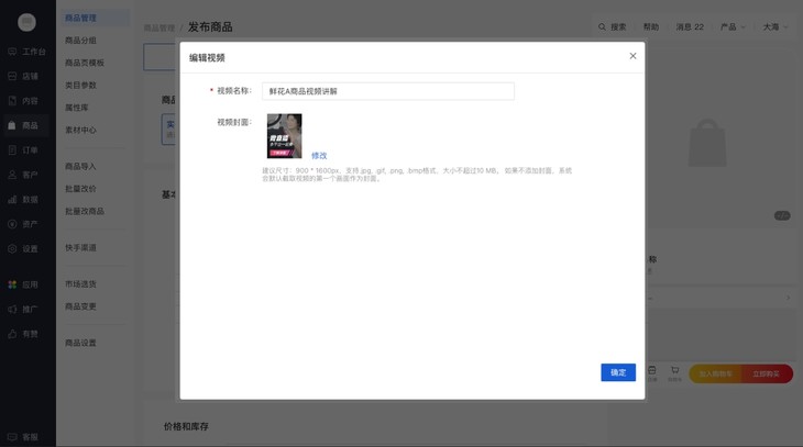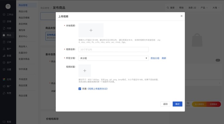 1、微商城PC后台-商品-商品管理-发布/编辑商品,“讲解视频”字段可以点击上传视频,视频建议比例9:16、大小在100M以内