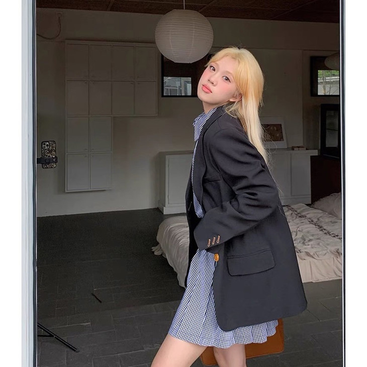 文案:春天好爱西装💛恰到好处的肩部剪裁,搭配A字廓形宽松但不肥大,穿着优雅随性~简简单单的时髦 海边走走逛逛 舒服自在🎧