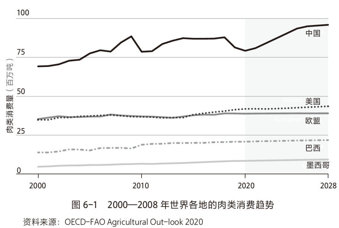 下图展示了世界各地的肉类消费趋势。美国、欧盟、巴西和墨西哥基本保持平稳趋势,中国表现出急剧增长趋势。
