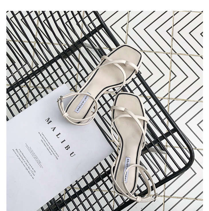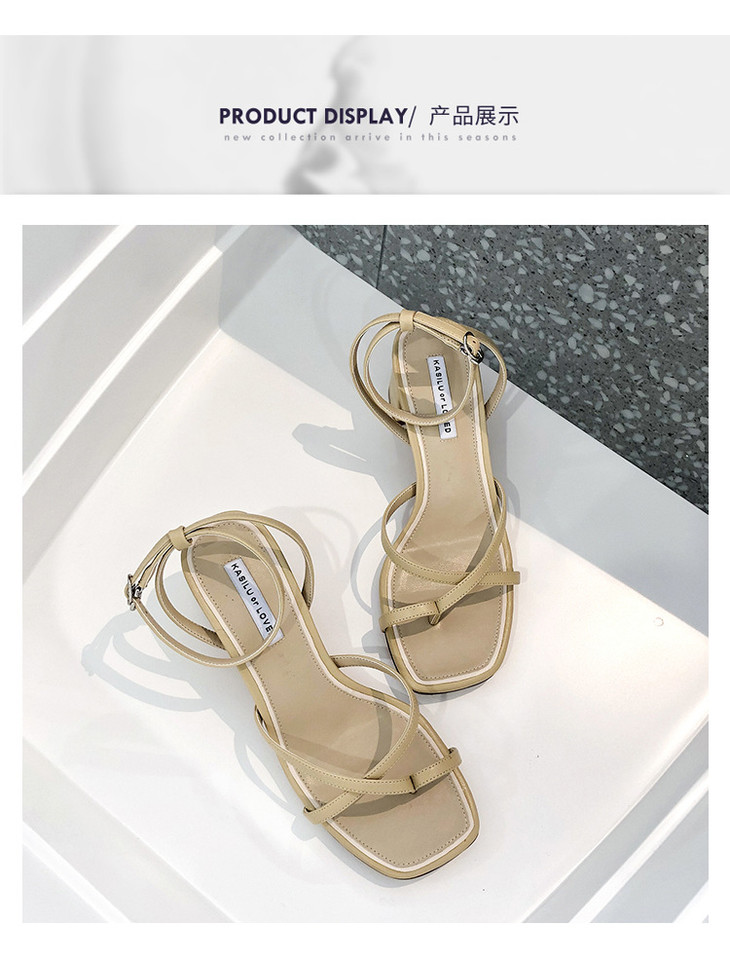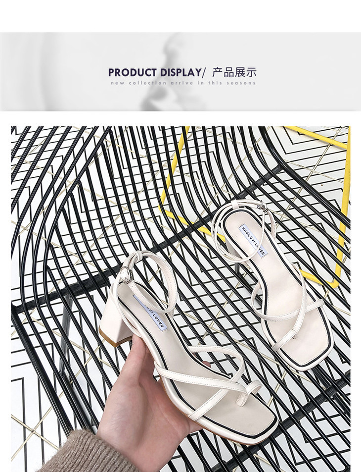 韩版中跟一字带罗马粗跟凉鞋