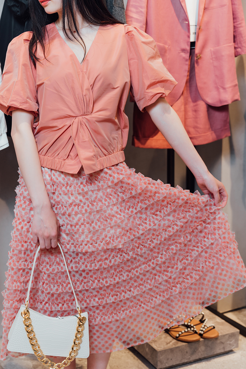 粉粉嫩嫩是春夏的专属颜色呀!桃红色泡泡袖加上波点裙,超级少女心~再搭配个橘色口红,完美!
