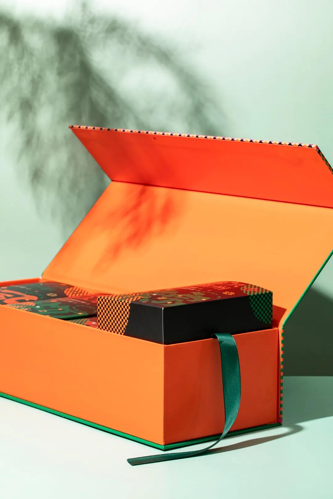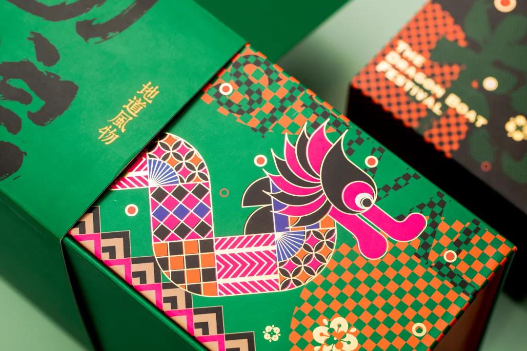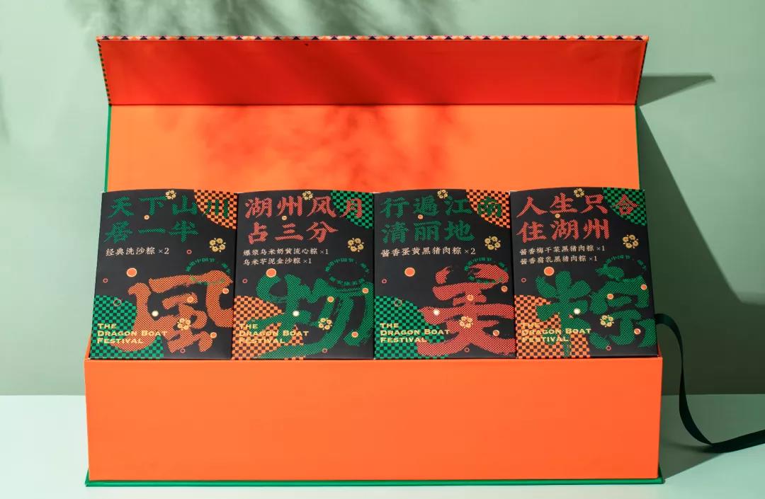 粽绿色和橘色的撞色礼盒,尽显国潮风范,礼盒上的主视觉是一条龙舟,灵感来源于湖州舞龙——长兴百叶龙。