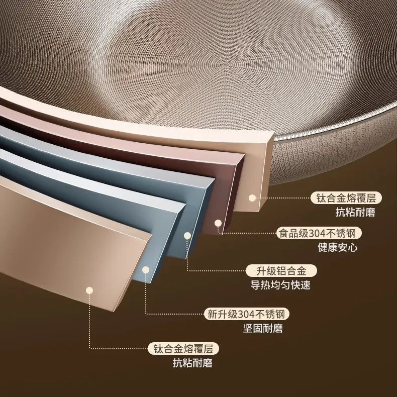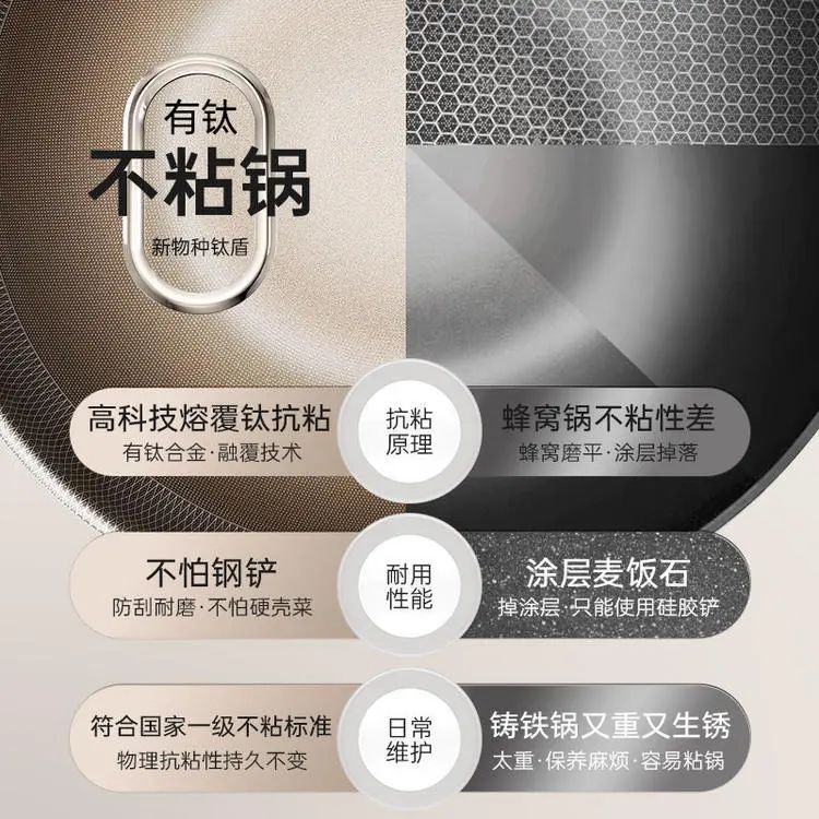 锅内采用钛熔覆技术,将钛打磨成颗粒融入内壁,替代传统化学涂层,属于纯纯的物理性抗粘!