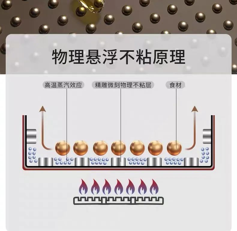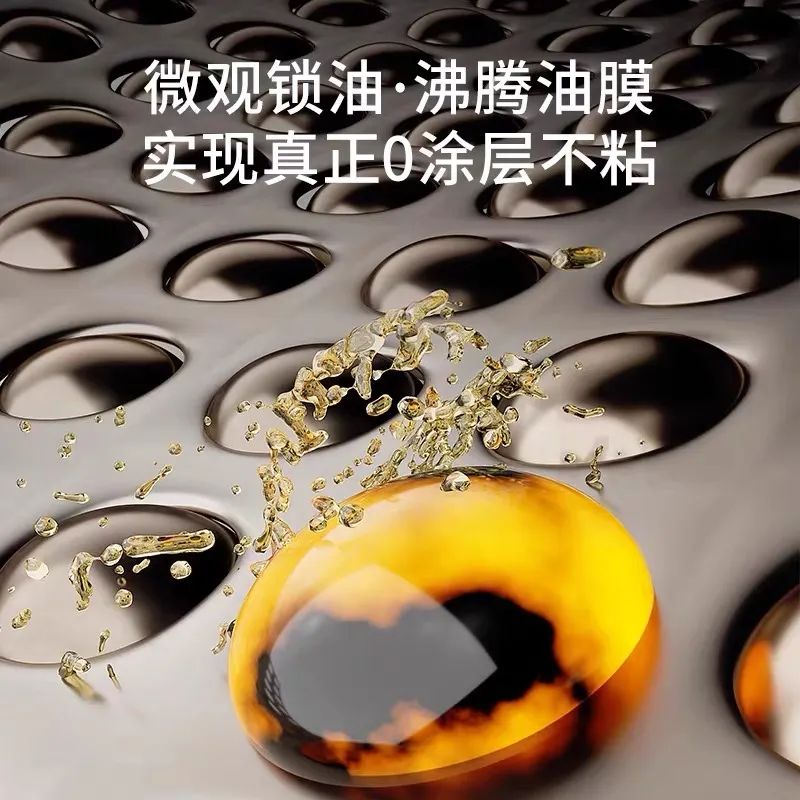 采用仿生微纳结构,模仿荷叶的超疏水性,水和油滴在锅面上会形成近乎完*美的球状
