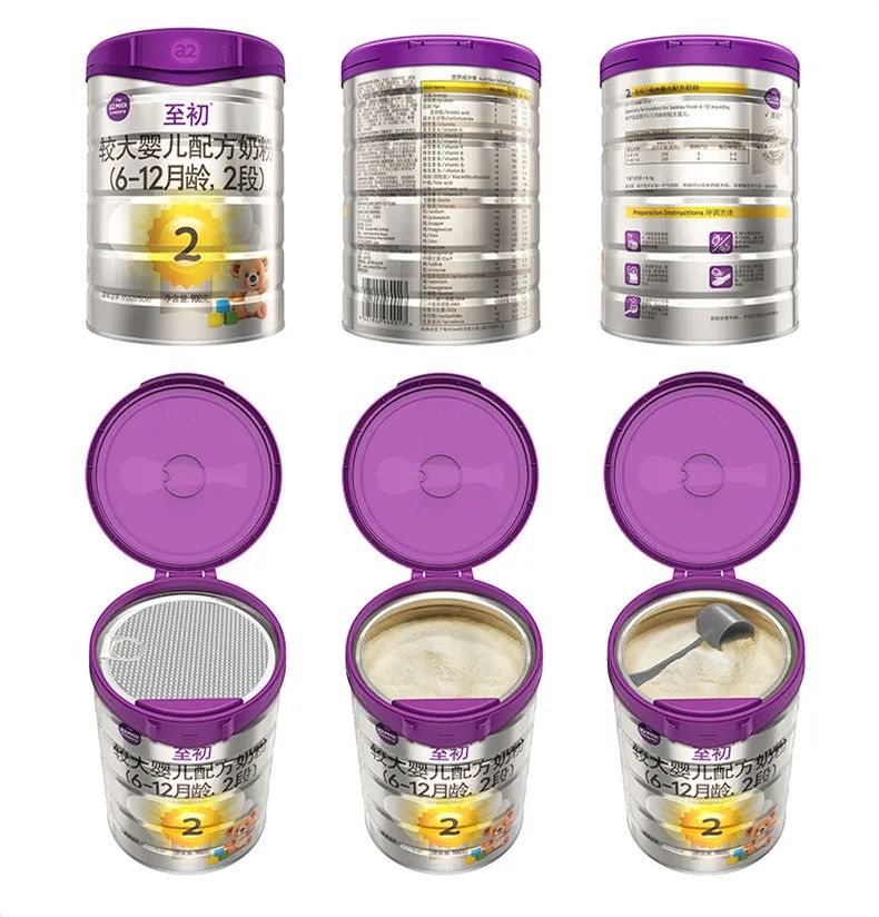 开罐设计:一次性塑封膜设计,密封保鲜,带有奶粉勺刮条,保证奶粉定量。