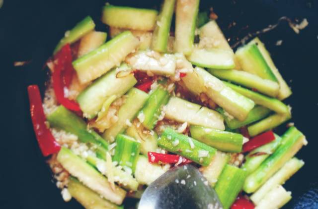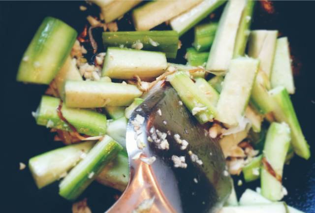 2、蒜蓉微黄时,放入丝瓜块翻炒;