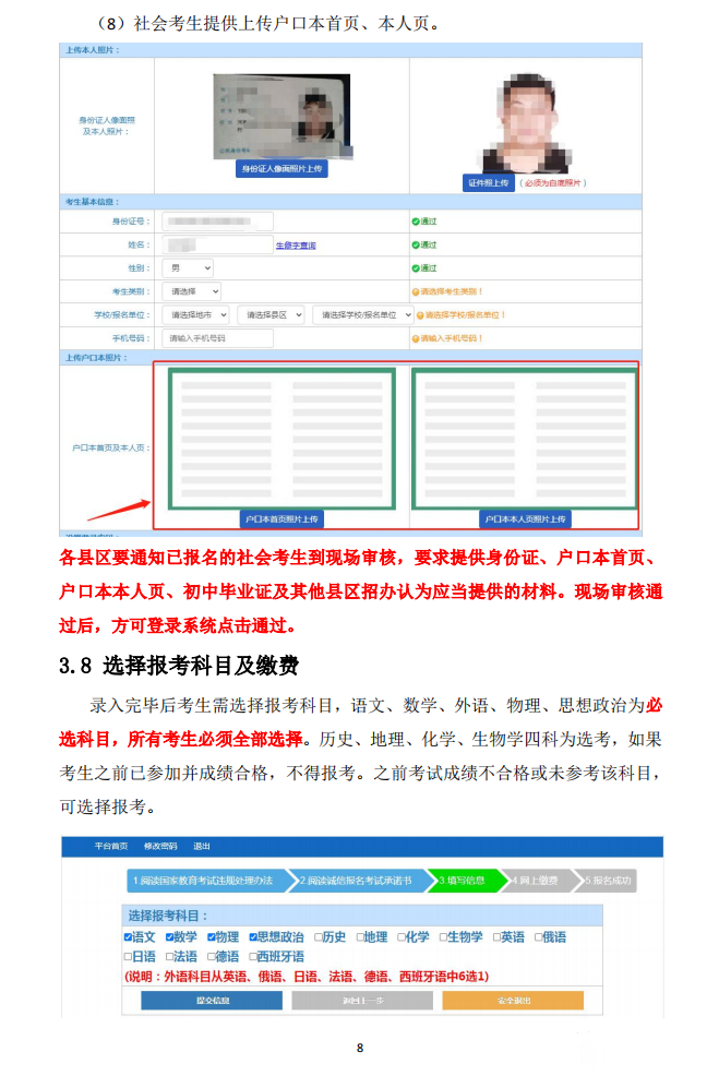 答:需上传本人头像照片和本人身份证照片,其中社会考生还必须同时上传户口本首页和本人页照片。