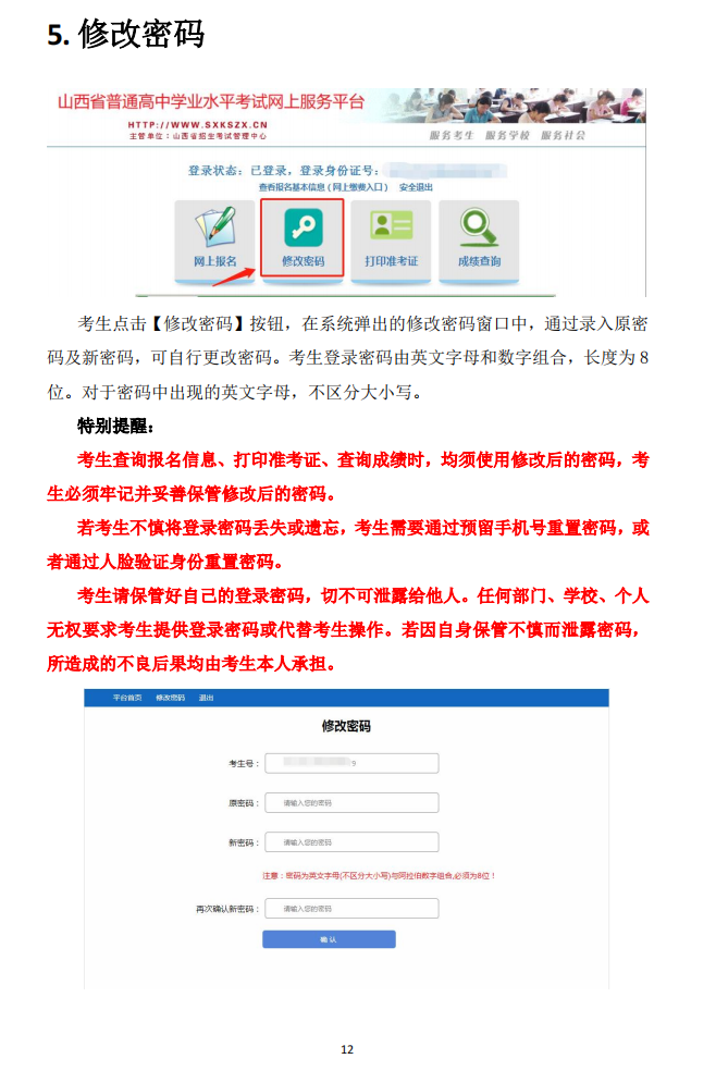 答:若考生不慎将登录密码丢失或遗忘,可通过手机短信重置密码,在登录界面点击“忘记密码”,进入重置密码界面,输入身份证号,点击“获取验证码”,系统会将验证码发送到预留的手机号上,输入验证码、新密码进行密码重置;或用手机扫二维码进入人脸识别页面,识别通过后进行密码重置;也可持考生本人身份证或准考证到所属县(市、区)招生考试机构申请密码重置。