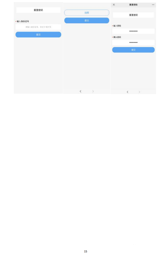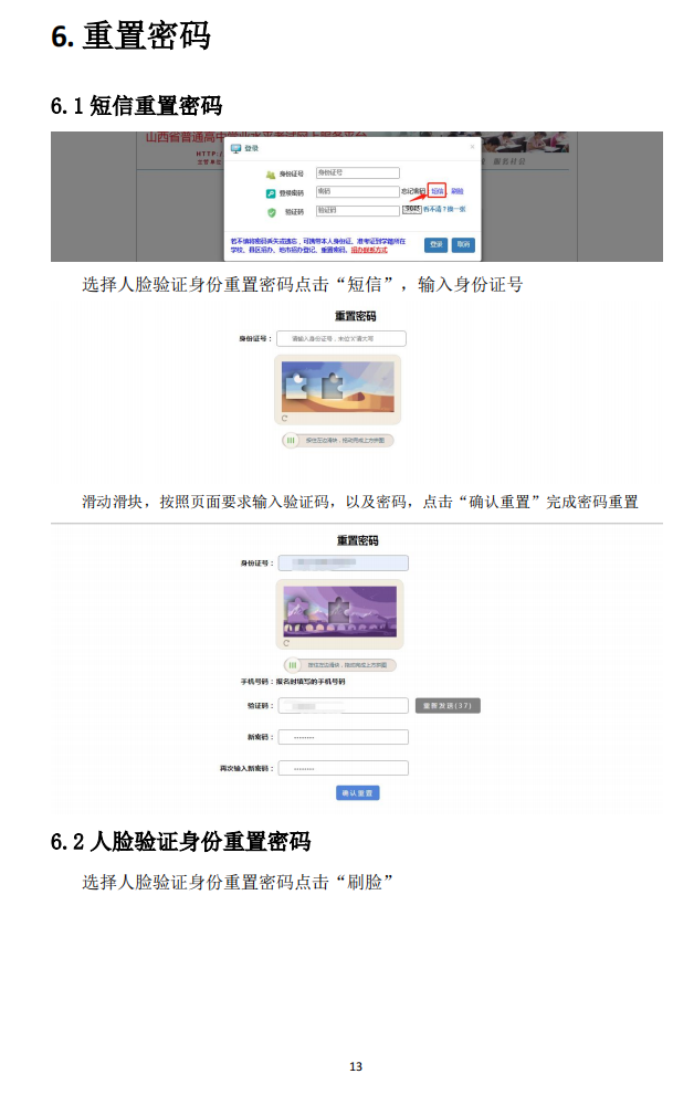 (二)若考生不慎将登录密码丢失或遗忘,可通过手机短信重置密码,在登录界面点击“忘记密码”,进入重置密码界面,输入身份证号,点击“获取验证码”,系统会将验证码发送到预留的手机号上,输入验证码、新密码进行密码重置;或用手机扫二维码进入人脸识别页面,识别通过后进行密码重置;也可持考生本人身份证或准考证到所属县(市、区)招生考试机构申请密码重置。