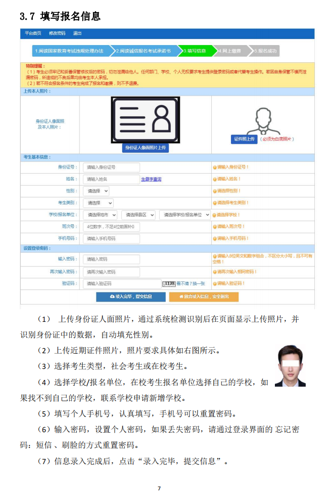 2.首次报考我省普通高中学业水平合格性考试的考生,登录网站后需先进行注册,注册时需准确填写各项基本信息,包括身份证号、姓名、性别、考生类别、班次号、手机号码等,同时要自主上传考生本人照片及本人身份证照片(图像信息要求:考生本人近期正面免冠彩色头像, 头部占照片尺寸的2/3,背景颜色为白色),其中社会考生还必须同时上传户口本首页和本人页照片,经报名系统比对无误后,提交保存。