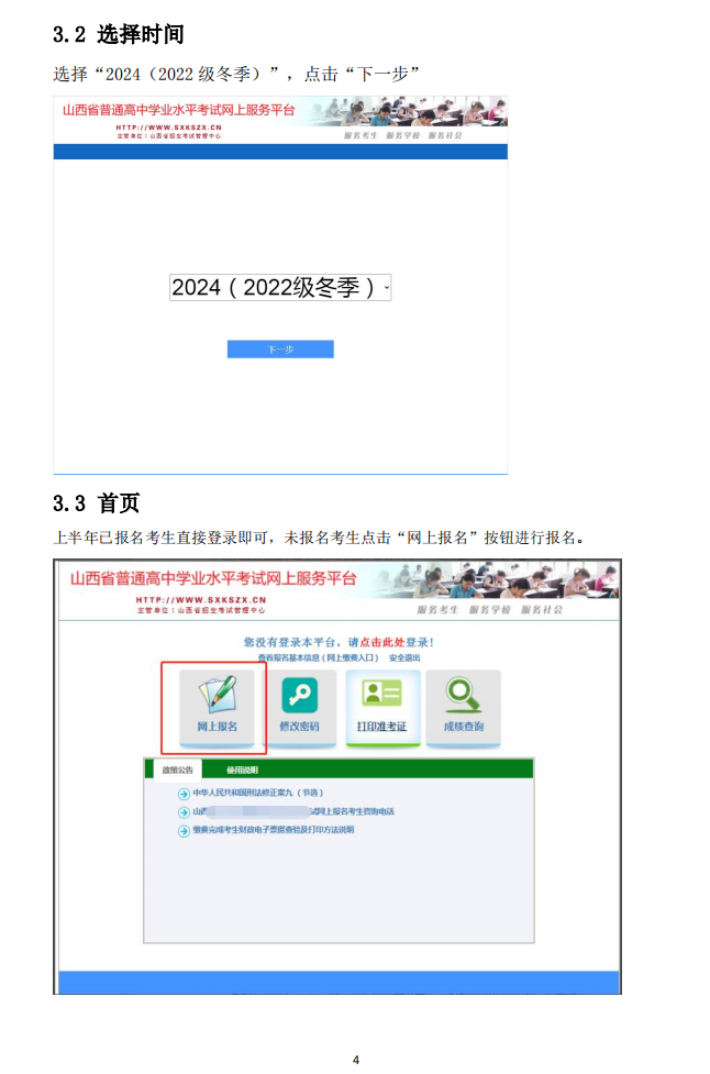 考生报名须登录山西招生考试网(www.sxkszx.cn),选择“考生登录”→“学业水平考试考生网上服务平台”,选择“2024(2022级冬季)”,点击“网上报名”功能按钮,进入网上报名信息填报页面进行报名。