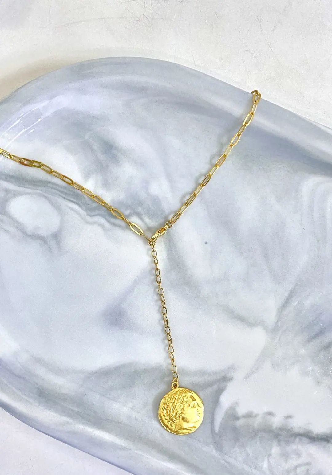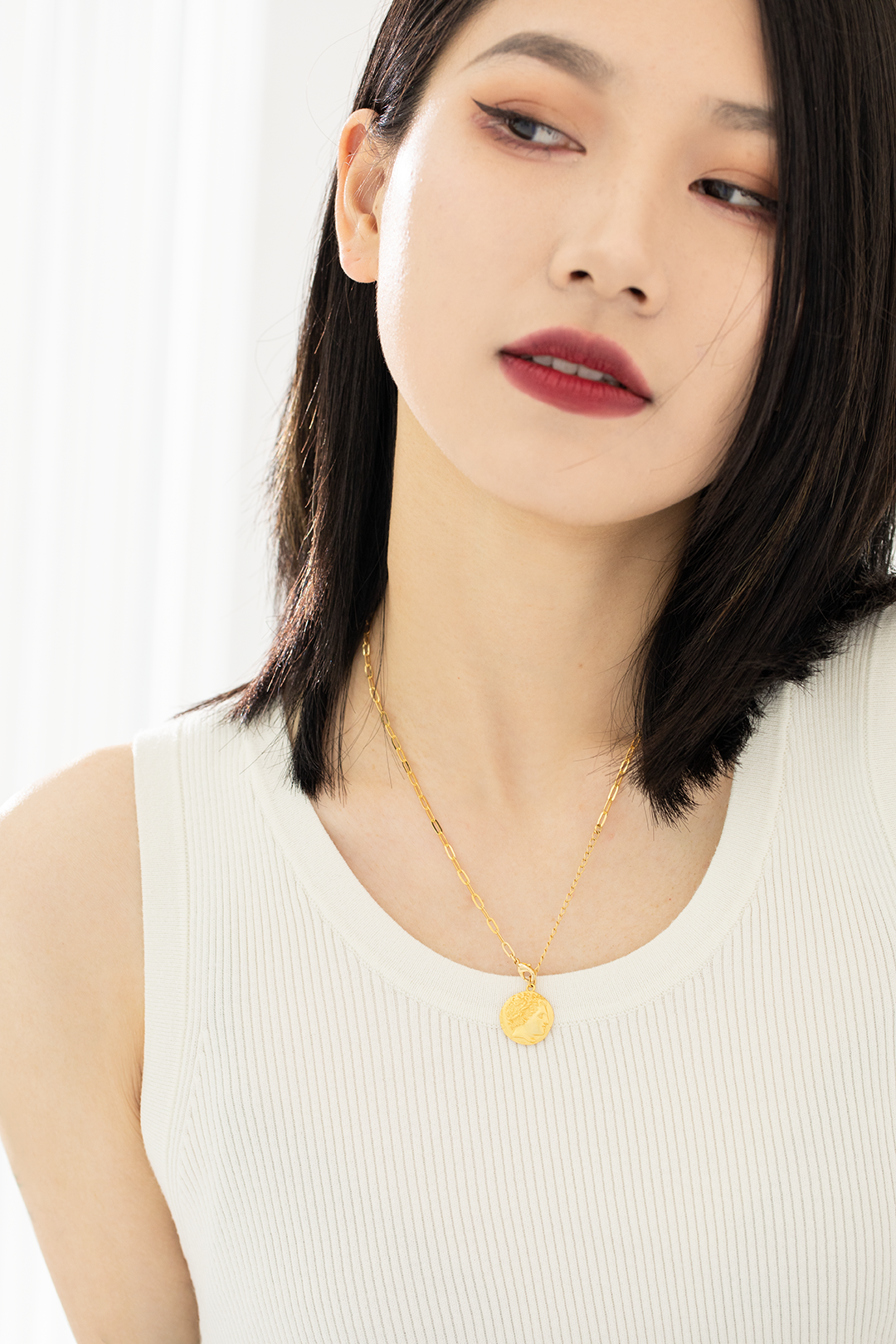 如果你觉得两个吊坠看着有点too much,也可以摘下爱心吊坠,直接当做金币Y字链来戴,更简洁干练又不失设计感。还有第四种戴法,把链条扣到金币吊坠的环那里,就变成最经典的金币项链啦!