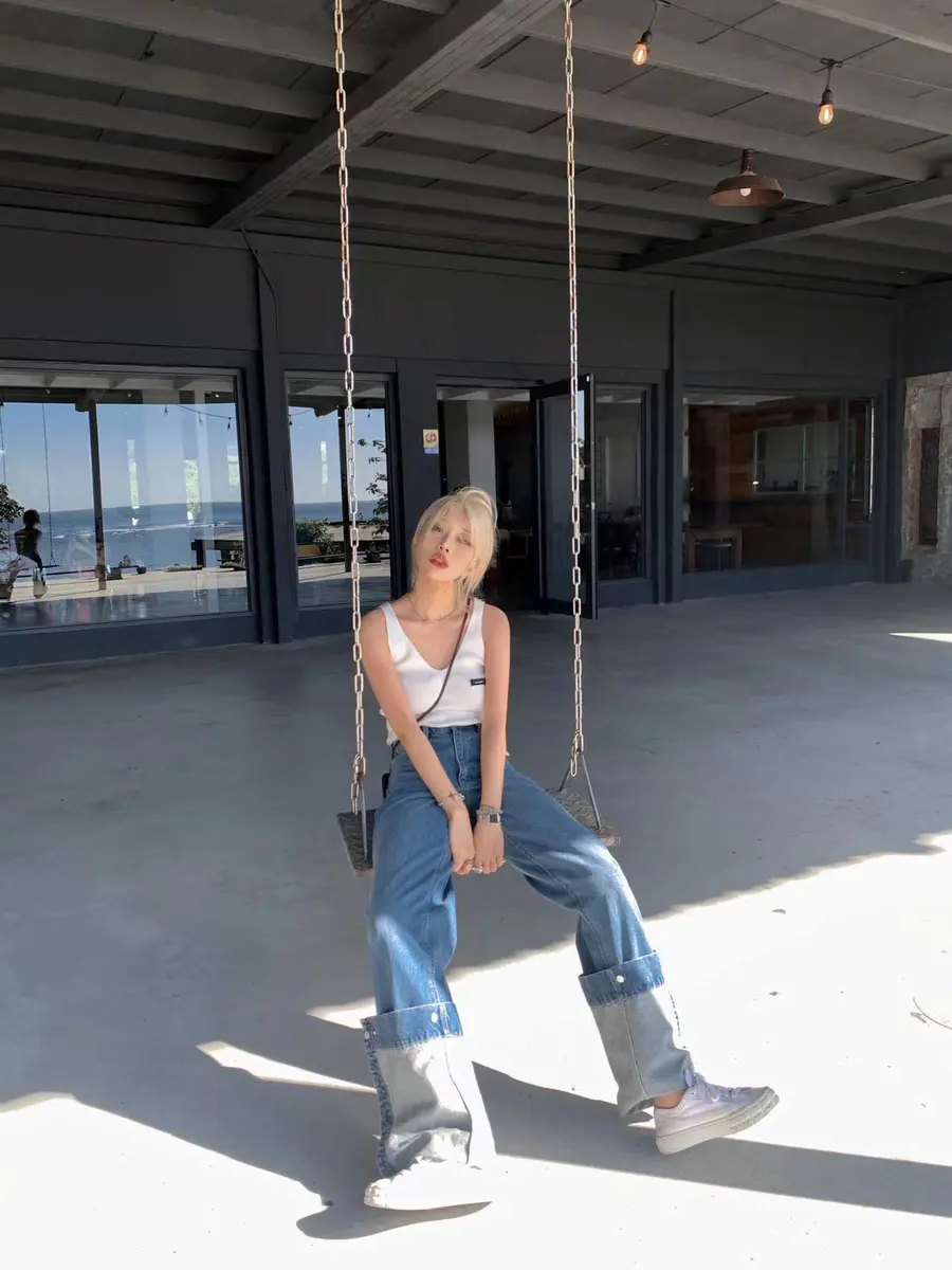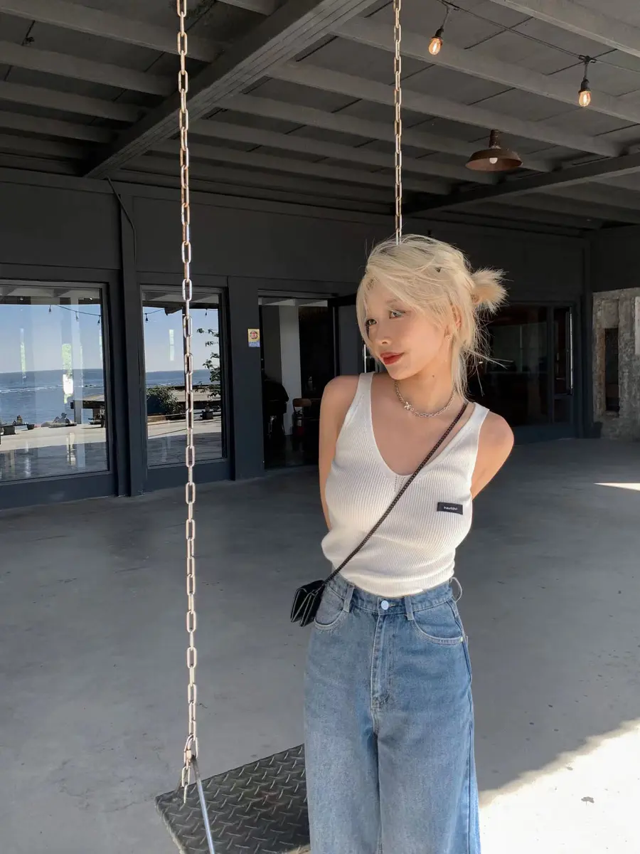 v领针织白背心+折边设计牛仔裤