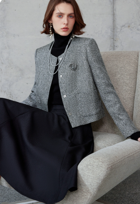 浅灰短款外套精致又干练,纹理细腻,自带高级感