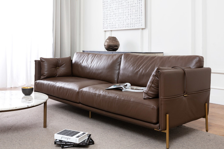 Prama沙发有着明朗干净的线条,外观设计融合了时髦的小细节,充满活力的咖色皮质搭配镀金脚架让质感加分,简约优雅,十分耐看。宽大舒适的尺寸加上饱满填充的靠包与坐垫,带来相当不错的坐感。细节设计更显用心,扶手侧边的隐藏插袋,贴心收纳各种随手小物件,多款尺寸可选,百搭适用多种空间风格~