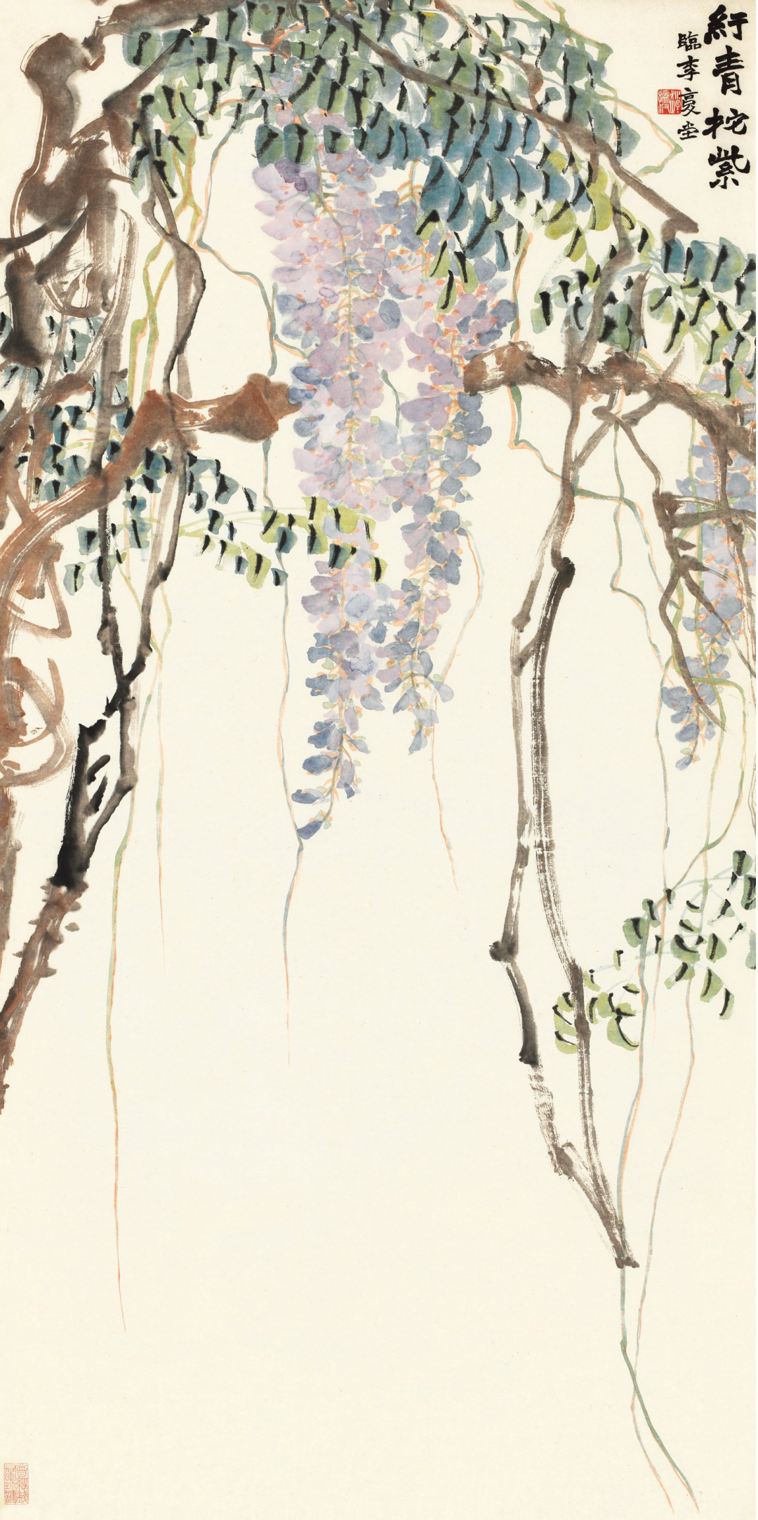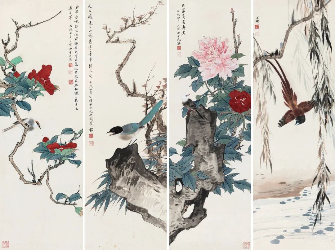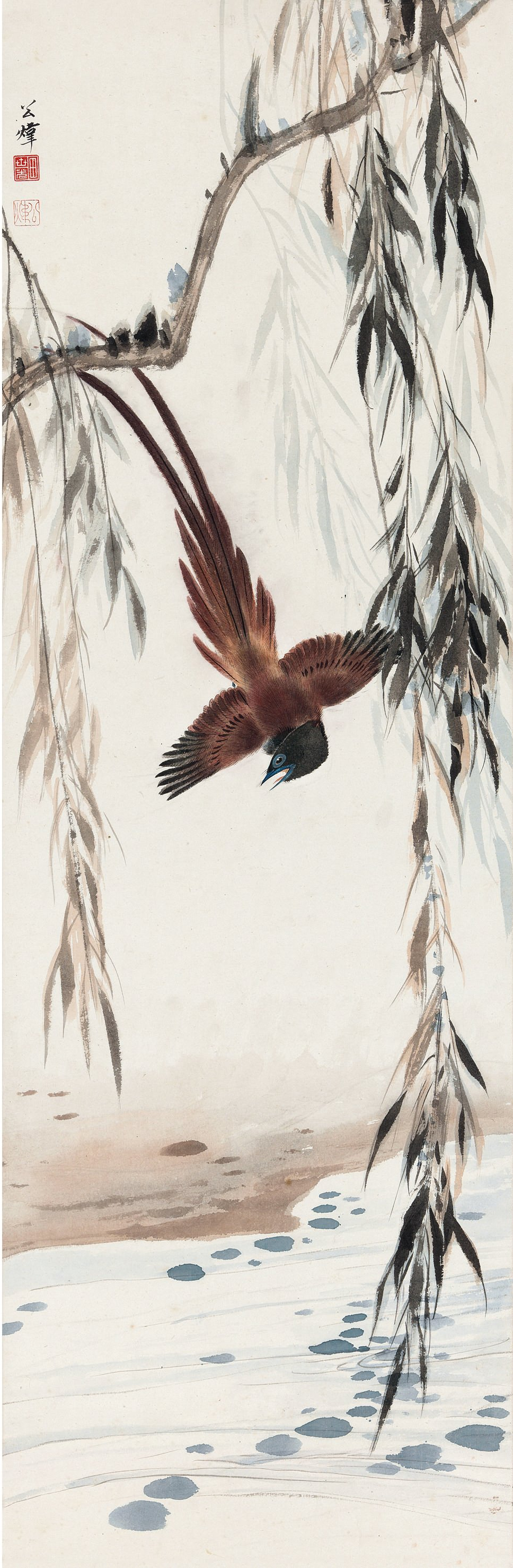 田世光(1916-1999)的花鸟专法宋元,师从于非闇,大量临摹历代名画,继承并发展了宋元双勾重彩花鸟画的技法。相比于乃师而言,田世光尤喜为花鸟营造一个优雅开阔的环境,依山傍水,借之唤起观者的田园幽思。