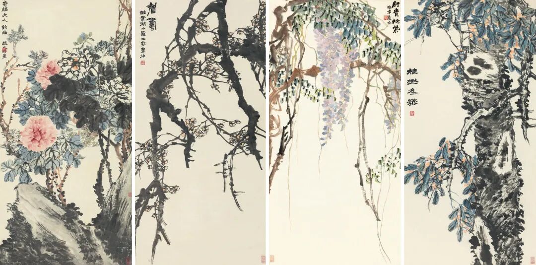 赵之谦的《花卉四条屏》以其独特的金石画风著称,将传统文人画的笔墨技巧与西方绘画的设色原理巧妙融合,形成了别具一格的艺术风貌。每幅作品尺寸约为138×69 cm,尺幅虽大,但构图精巧,细节丰富,展现出画家深厚的艺术功底和精湛的技艺。