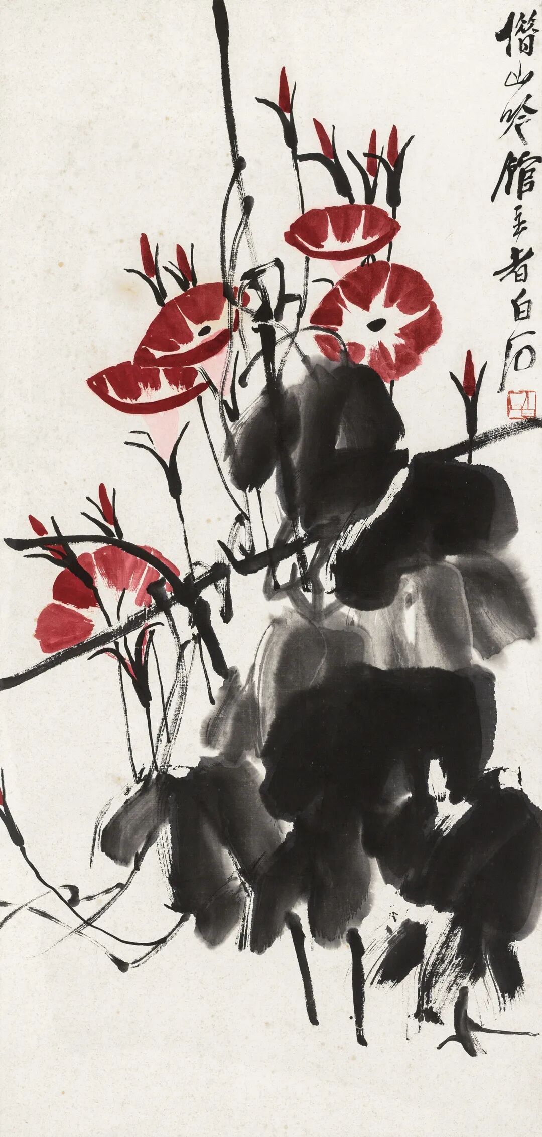 此套可称齐白石「红花墨叶派」之典型,四屏分写荷花、海棠、牵牛、菊花,笔墨酣畅,骨势雄健,皆设色「喜红」,满溢喜庆吉祥。