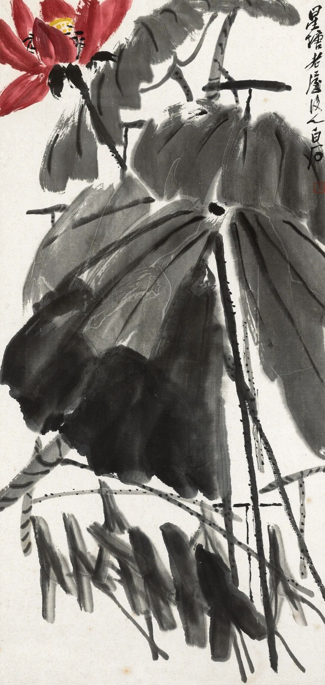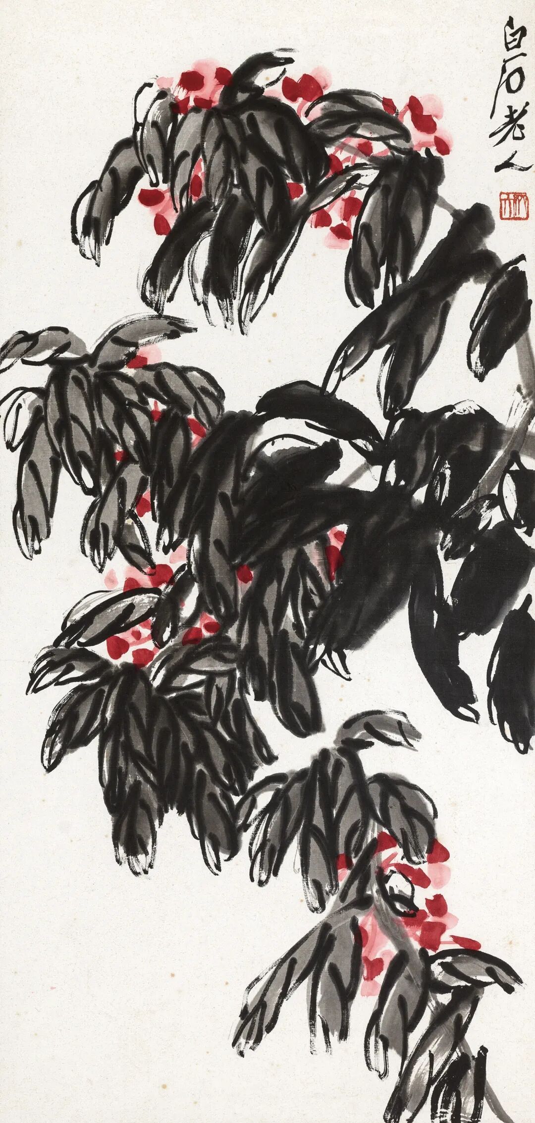 再观四屏,白石老人营造巧妙自然,依照物象组织笔墨,强调虚实和墨色乾湿的变化对比,起伏有致,微妙多端。在红与黑,浓与淡,乾与湿,疏与密的对比中挥洒笔墨,讲究法度,真率自然,拙中寓巧;用笔雄浑健拔,骨肉兼得;用色酣畅淋灕,墨气飞扬,将其「似与不似」的主张彰显得淋灕尽致。