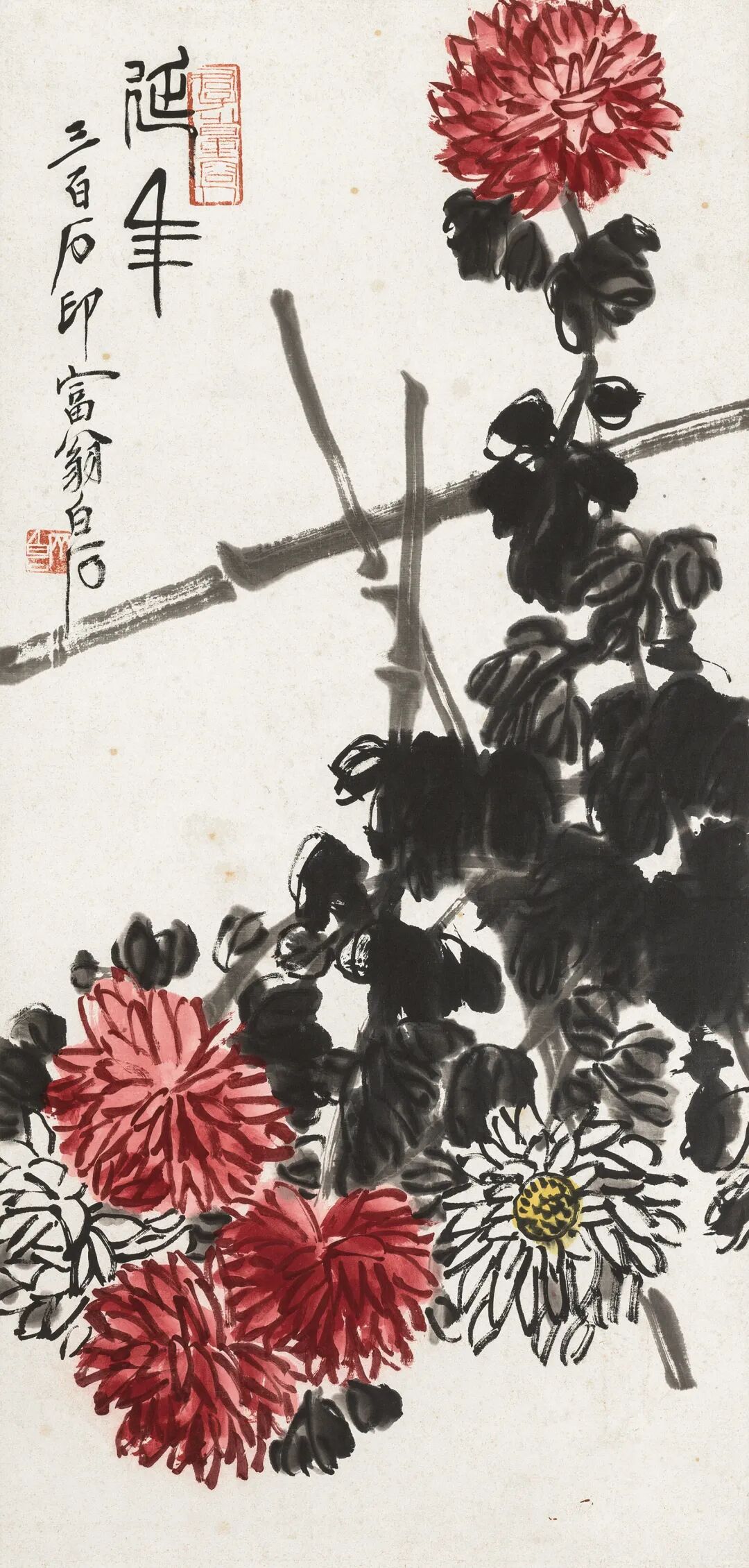 「延年」一屏,写双色菊花,一本沿篱出枝,鹤立鸡群;五朵花重而弯,锦绣团簇。红菊艳而不俗,白菊雅而不寒,墨叶滋润淋灕,浓淡相宜。
