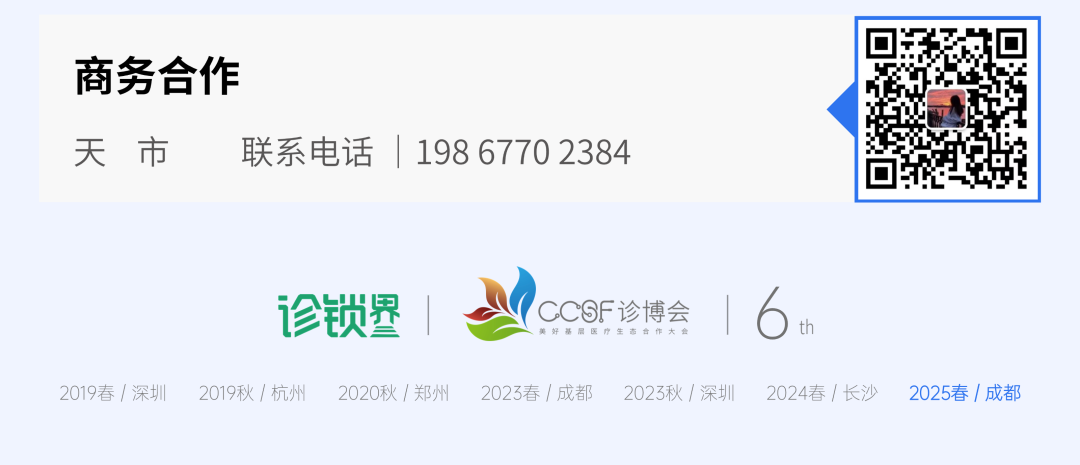 2025年3月26日-28日,2025第六届诊博会将在中国成都举行。诊锁界成立以来一直致力于搭建促进我国基层医疗行业发展的桥梁与平台,2025诊博会将会是又一里程碑,我们热切期盼与众多杰出的基层医疗产业同仁携手共进,在本次大会上共同“涌现”!