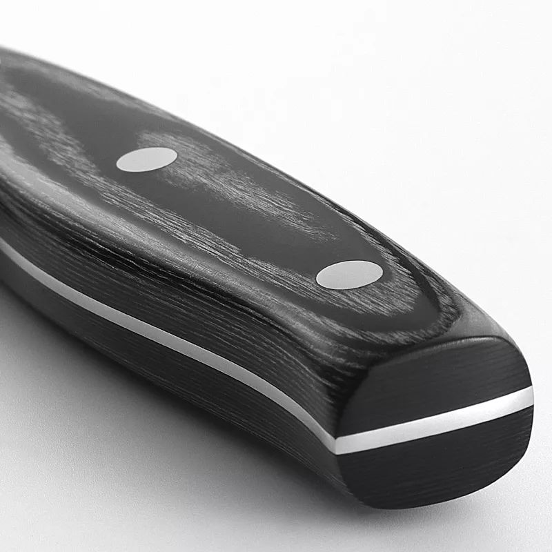 西式厨刀款采用33层彩木压制刀柄,由复合材料液压而成,密度高,不渗水,仿若原木材质的温和手感。