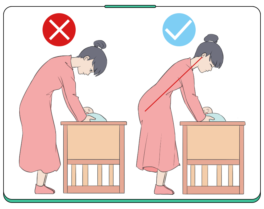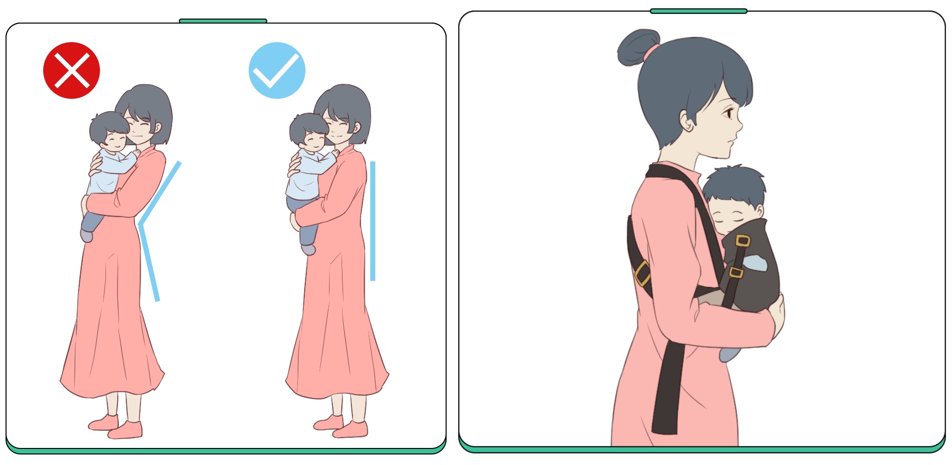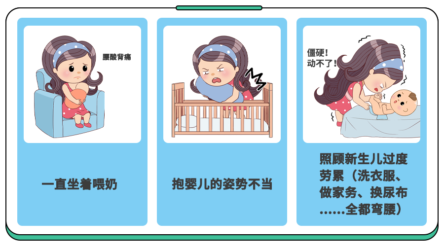 错误姿势+劳累:带娃时,弯腰哺乳、久坐抱娃、低头哄睡、弓背换尿布等动作,让腰肌持续紧张牵拉,久之引发劳损。