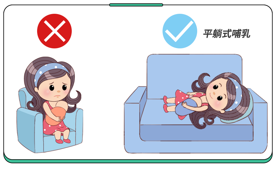 喂奶时常换姿势,减少久坐,可采用平躺哺乳。