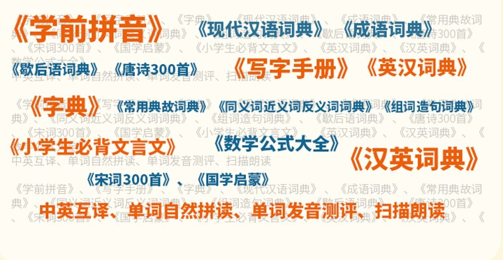 不论是语文的汉字笔顺、拼音发音、成语典故,或者更复杂的文言文、诗词,还是英语单词的自然拼读、教材释义、同根词、短句例句等等,扫描一下就知道,轻轻松松消除孩子们的阅读障碍。