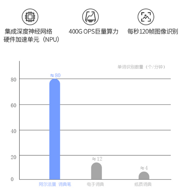 阿尔法蛋词典笔,内置深度神经网络硬件加速单元(NPU),每秒120帧图像识别,不再需要孩子手动输入,只需要对着单词和句子轻轻一扫,不到1秒钟,就能轻松实现查词翻译,让查询从此变得高效快捷。
