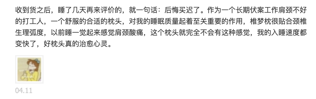这个时候一个好的枕头就体现出他的重要性,枕头的目的在于维持角度,保持人的颈椎与枕头的贴合,从而达到帮助减轻颈椎压力的作用。