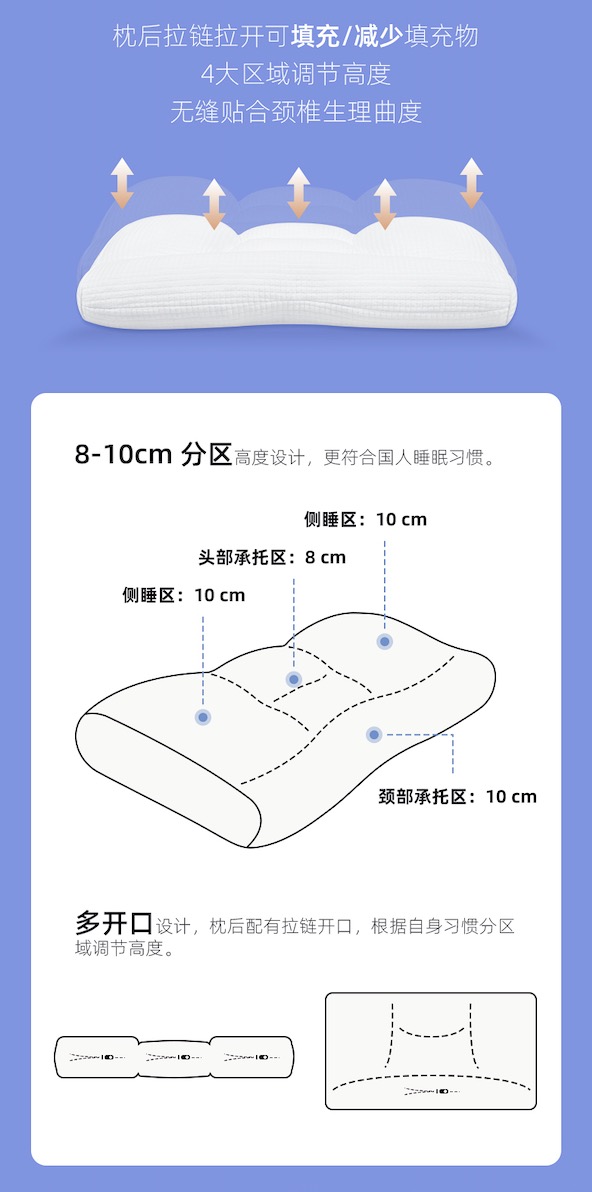 我们会另送一包填充物,四大区域都有独立的拉链,根据自己的颈部曲线自由调节填充物的量,改变高度,适合自己。