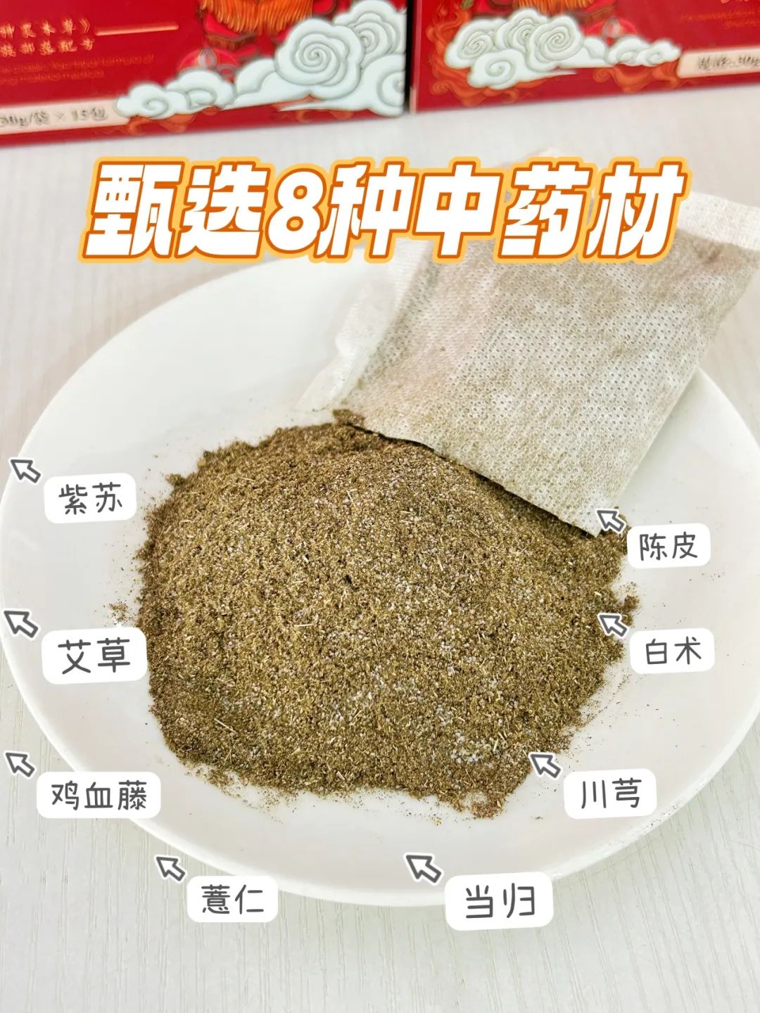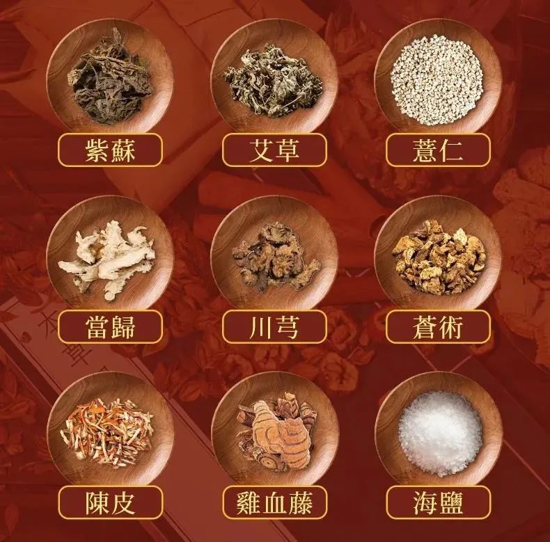 紫苏、艾草、薏仁、当归、川芎、白术、陈皮、鸡血藤、海盐,8味中草药综合研制。