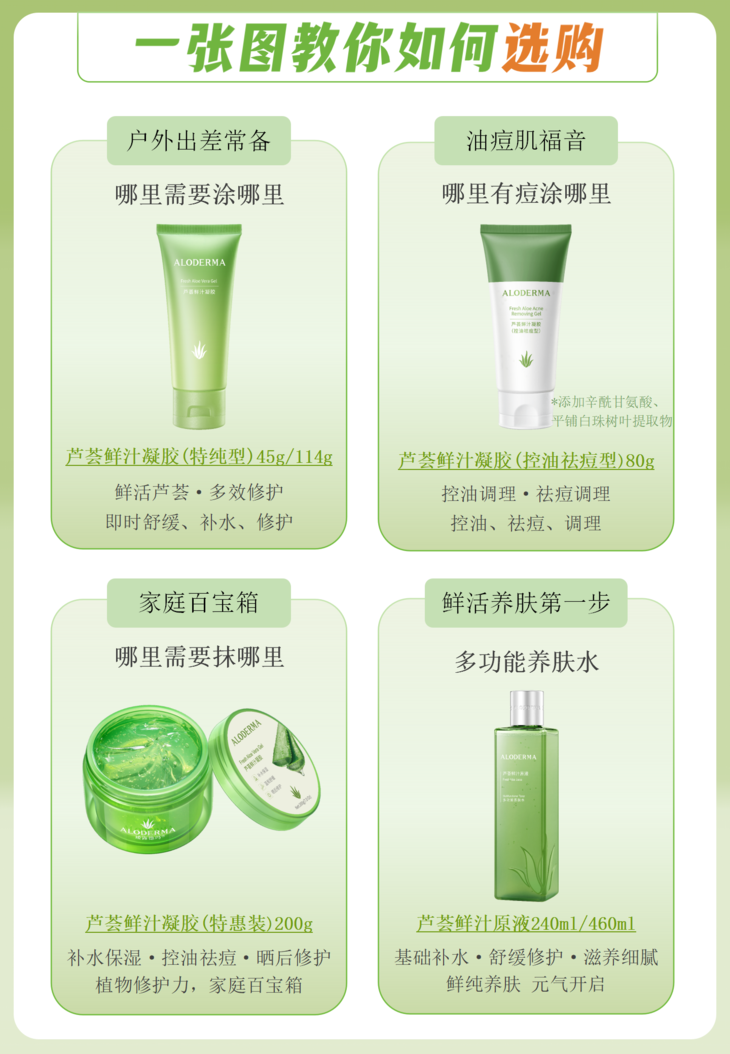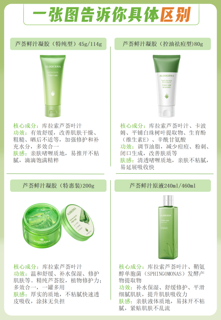 下面,就直接用一张图来带着大家区分一下这四款不同芦荟产品的具体不同之处: