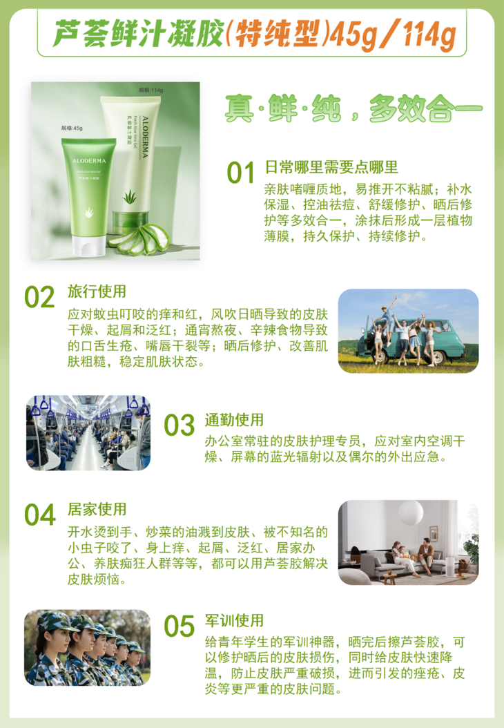 经常旅行或者出差的小伙伴,可以选芦荟鲜汁凝胶(特纯型)45g/114g,管状包装,更加方便携带。